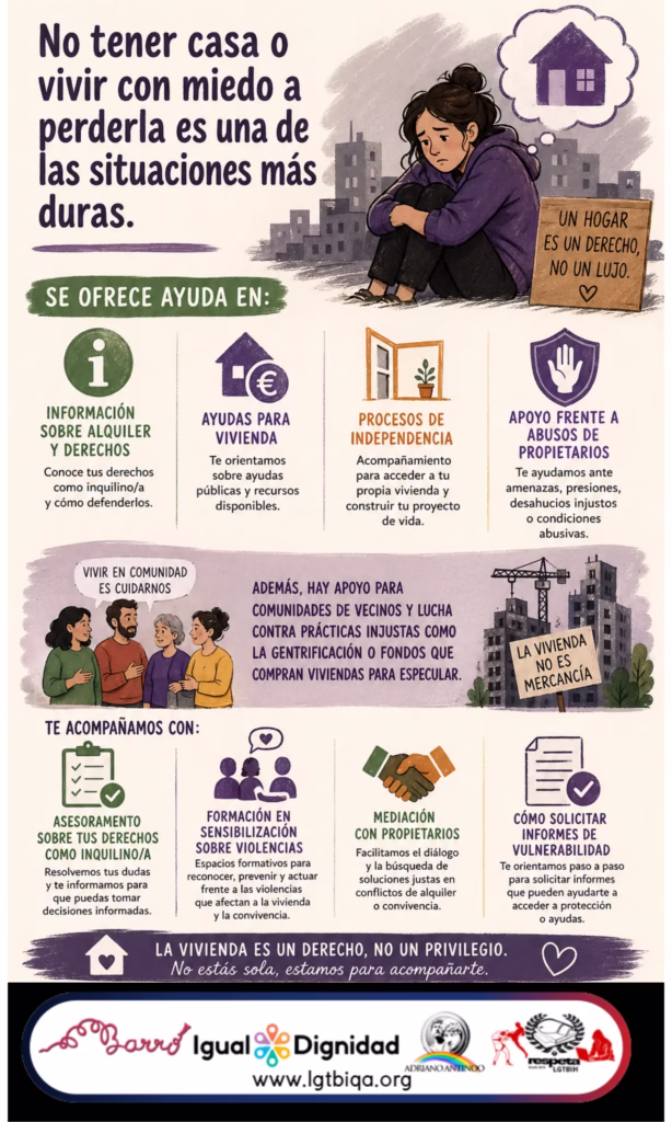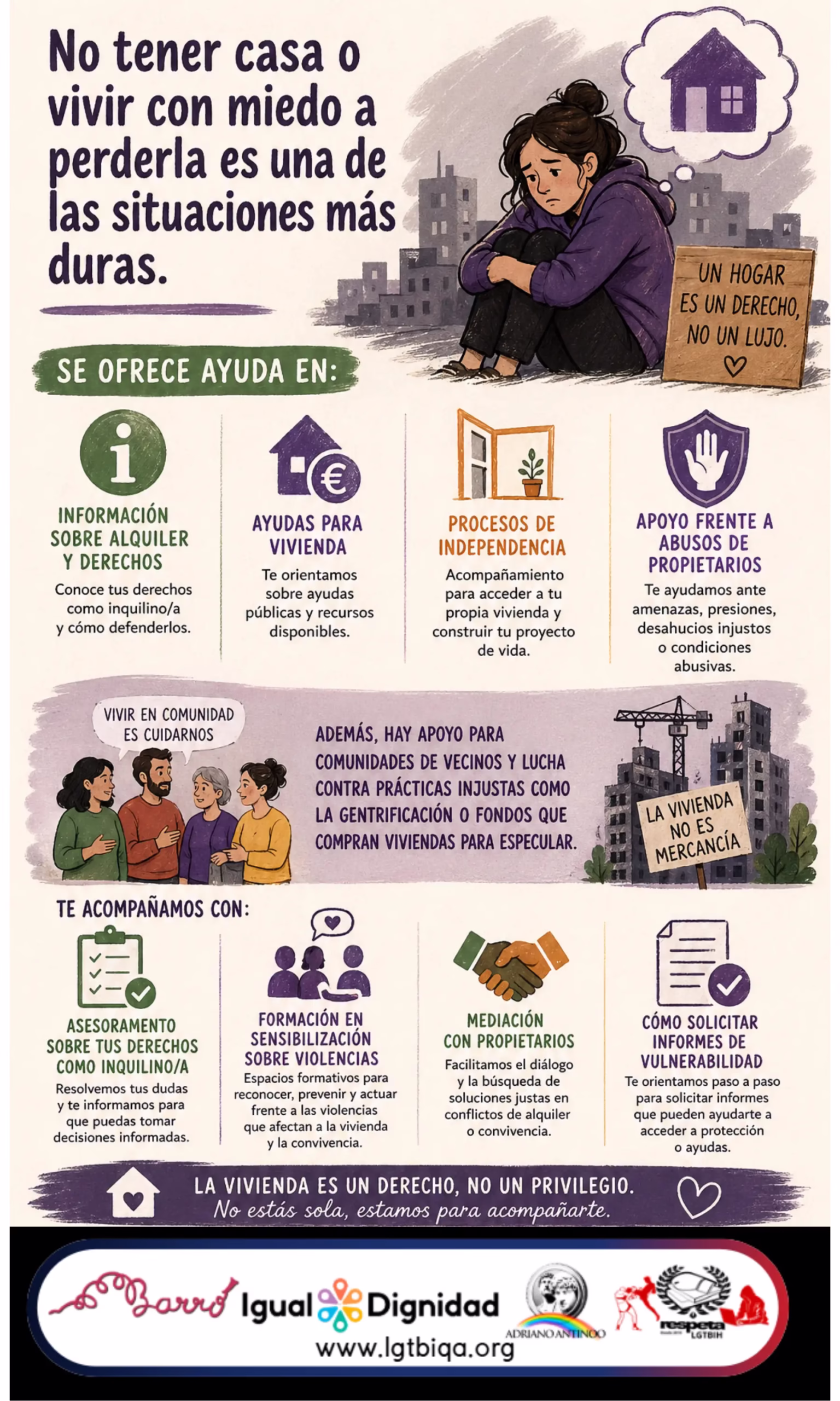 Además, hay apoyo para comunidades de vecinos y lucha contra prácticas injustas como la gentrificación o fondos que compran viviendas para especular .
