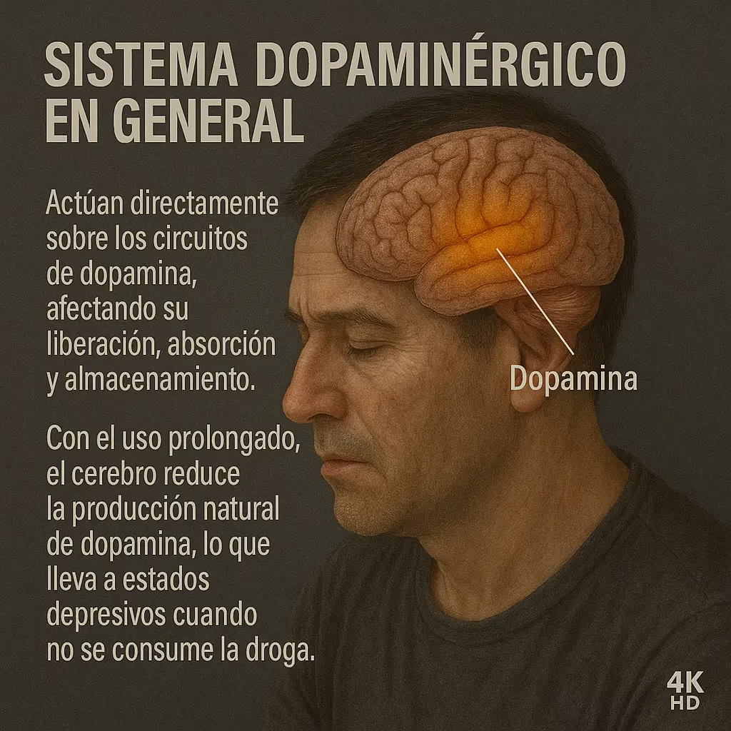 Con el uso prolongado, el cerebro reduce la producción natural de dopamina, lo que lleva a estados depresivos cuando no se consume la droga.