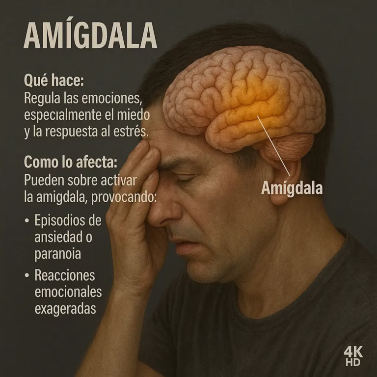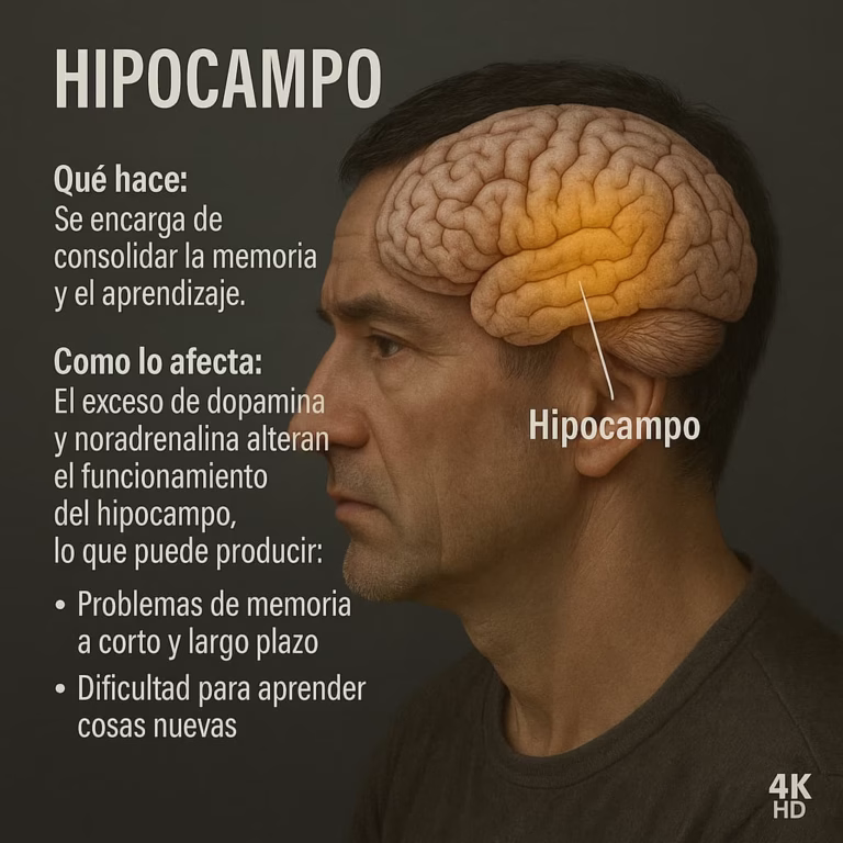 Cómo lo afecta: El exceso de dopamina y noradrenalina alteran el funcionamiento del hipocampo, lo que puede producir: